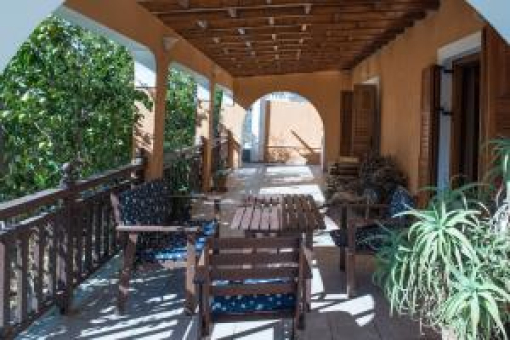 De grandes verandas avec des bergolas en bois et vue sur la mer et un jardin avec des arbres fruitiers entourent la maison.